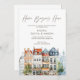 "Home Begins Here" with this charming and colorful watercolor European townhouse housewarming invitation. The simple and stylish design, featuring charming details and a clear layout for all event information, including the RSVP details. This unique card is ideal for a modern couple hosting a sophisticated yet fun party