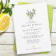 Invitation de mariage avec une simple et élégante composition de citrons aquarellés et de verdure dans un pot avec une police classique en dessous. Au dos de l'invitation, une éclaboussure aquarelle à fond perdu en jaune et vert.