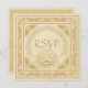 Cette carte de réponse de mariage Claddagh au motif celtique présente des motifs d'animaux entrelacés celtiques sur la bordure avant extérieure et les coins entourant l'anneau Claddagh irlandais traditionnel avec les mains tenant un cœur (de dessins en spirale celtiques) avec une couronne symbolisant l'amitié (mains), l'amour (cœur) et la loyauté (couronne). L'anneau est complété par un travail de nœud celtique traditionnel. La texture de fond est dérivée d'un ancien manuscrit médiéval. Le dos présente également cette texture de fond médiévale et comporte également une bordure de nœuds celtiques en or classique.