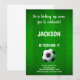 Préparez-vous à fêter cet anniversaire de football vert audacieux avec des lignes de terrain réalistes et une disposition propre et sportive! Parfait pour les garçons ou les filles qui aiment le jeu, cette carte modifiable permet de personnaliser facilement les détails de votre fête en utilisant les outils de design en ligne de Zazzle. Un choix idéal pour les enfants sportifs et les anniversaires thématiques d'équipe.