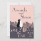 Mise en page de sauvegarde de la date, avec élément de chats et vue urbaine. Conception de dessin animé, appropriée pour les annonces de mariage, les fiançailles. Le texte doit être personnalisé.