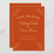 Il s'agit d'un style minimaliste personnalisable simple Save the Date faire-part de mariage en orange foncé. Le texte et les feuilles sont dans une couleur or jaune doux. Il est parfait pour un thème tropical ou mariage de automne.