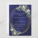 Pour un mariage d'hiver. Un arrière - plan bleu marine aux couleurs irrégulières décoré de cônes, de baies blanches et de verdure. Un cadre ovale en faux or. Personnalisez et ajoutez vos noms et détails.