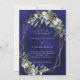 Pour un mariage d'hiver. Un arrière - plan bleu marine aux couleurs irrégulières décoré de cônes, de baies blanches et de verdure. Un cadre géométrique en faux or. Personnalisez et ajoutez vos noms et détails.