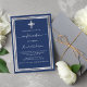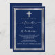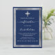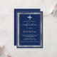 Une invitation moderne, élégante et raffinée. Un arrière - plan bleu marine décoré d'une fausse croix argentée et de faux cadres argentés. Personnalisez et ajoutez un nom et des détails. Texte blanc.
