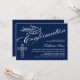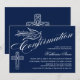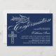 © Designs socialites. Notre belle invitation de confirmation de calligraphie a une colombe, croix et belle calligraphie texte. L'arrière - plan est bleu foncé. Une belle invitation qui n'est pas sexiste et peut être utilisée pour un garçon ou une fille. Remplacez facilement notre texte modèle par le vôtre. Tous les éléments de conception peuvent être déplacés, redimensionnés ou supprimés.