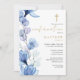 Cette élégante invitation de confirmation florale transparente et bleu poussiéreux peut être personnalisée avec vos informations en typographie chic avec votre monogramme au verso. Conçu par Thisisnotme©