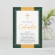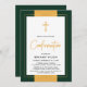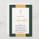 Invitation de confirmation élégante en or et en vert. Conception de croix froides et de script "Confirmation" à l'intérieur d'un cadre moderne branché et de bordure dorée. Parfait pour la confirmation de garçon.