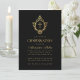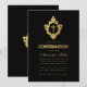 Cette élégante invitation de confirmation noire et or avec une atmosphère vintage, recommandée pour un garçon, comporte une crête florale vintage avec une croix, les deux en faux or. Le nom du garçon est écrit dans une élégante écriture calligraphique. Le texte est d'une couleur dorée similaire à la crête en faux or. Le fond est noir.