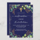 Un arrière - plan bleu marine décoré de verdure d'eucalyptus et de feuilles dorés et de parties scintillant en faux or brille. Une croix d'or. Personnalisez et le nom de l'enfant et les détails de la cérémonie. Retour : arrière - plan bleu marine.