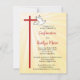 Les rayons dorés sont une belle toile de fond pour une invitation de confirmation de fille. Une colombe, représentant l'Esprit Saint, survole une croix rouge. Personnalisable pour ajouter vos propres détails de cette Confirmation et de la fête. Parfait pour la famille invitation et les amis à cet événement saint pour la confirmation de fille.