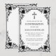 Cette invitation de confirmation vintage noir et blanc présente un cadre orné antique avec des décorations baroques élégantes. Au-dessus du texte se trouve une croix religieuse. Le texte, la croix et le cadre sont noirs, le fond est blanc. Tout le texte peut être personnalisé.