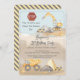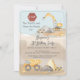 Créé avec une aquarelle muette moins palette traditionnelle, ce design de fête d'anniversaire 3ème comprend un camion à benne et une pelle à dos sur un chantier avec la légende "Arrêtez le trafic et fermez les routes pour" l'anniversaire de votre enfant. La palette muette se poursuit sur le dos avec un motif rayé gris fusain et jaune plus doux. Conception composite par Holiday Hearts Designs (droits réservés).