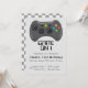 Contrôleur de jeu vidéo Cool, invitation à la fête d'anniversaire des garçons sur le thème des joueurs. Arrière-motif gris et blanc à damiers. Plusieurs lignes de texte modèles pour vos informations.