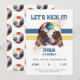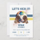 Lancez le fun avec cette Invitation d'anniversaire de Cool Boys Sports Soccer, parfait pour une fête d'enfants sur le thème du sport ! Le design comprend un ballon de football coloré, des gants de football brun et des rayures rétro bleu et jaune. L'invitation d'anniversaire de ce garçon ajoute un style sportif à toute célébration. Personnalisez avec les détails de l’anniversaire de votre enfant pour une touche unique. Cet invitation sportif d'anniversaire est idéal pour les tout-petits, les enfants ou les adolescents qui aiment le football. Associez-vous aux décorations d'anniversaire de football et aux activités thématiques pour une journée gagnante !