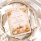 A warm and cozy fall baby shower design featuring a hand-painted watercolor pumpkin surrounded by soft peach florals, golden leaves, and delicate autumn accents. The earthy orange palette and elegant arch layout create a refined harvest aesthetic that feels timeless and inviting. Perfect for an autumn celebration, a neutral fall theme, or a charming “Little Pumpkin” baby shower with rustic floral details.