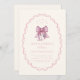 Photo Coquette Pink Bow Graduation Invitation Célébrez votre graduation avec style et élégance en utilisant la Photo Coquette Pink Bow Graduation Invitation. Dotée d'une délicate illustration en arc rose, de tons pastel doux et d'une typographie raffinée, cette invitation mélange sophistication et touche féminine. Une photo personnalisée ajoute un élément unique et personnel, ce qui en fait la meilleure façon d'annoncer votre journée spéciale. Caractéristiques : Coquette Chic Aesthétique - Conçu avec un arc rose dainty et des détails doux et romantiques pour un look intemporel. Photo personnalisée - Montrez votre portrait de graduation préféré pour une touche vraiment personnalisée. Une typographie élégante - Une mise en page de police sophistiquée qui améliore le style raffiné de l’invitation. Qualité Premium - Imprimé sur un carton de haute qualité pour une finition luxueuse et professionnelle. Détails personnalisables - Personnalisez avec votre nom, la date de fin d'études, l'école et les informations sur l'événement. Options numériques et d'impression - Choisissez une version imprimable ou faites-la imprimer et livrer professionnellement. Parfait pour une fête sophistiquée mais ludique de remise de diplômes, cette invitation donne le ton d'un événement mémorable et élégant. Commandez maintenant pour ajouter une touche de coquette au charme de votre faire-part de graduation.