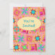 Invitation un amoureux de courtepointe ou de courtepointe avec cette invitation colorée entièrement personnalisable. Customisez pleinement sur le devant et le dos pour ajouter vos propres mots, noms et autres informations. Cet art original de courtepointes fait une invitation vibrante. L'art de la surface composée à partir de l'art original présente des blocs de surface de patchwork préférés, ainsi que des blocs uniques aux couleurs vives et dynamiques d'orange, jaune, rose, turquoise et vert citron sur un arrière - plan corail orange pour une belle palette de couleurs. Un ovale jaune ensoleillé est sur le devant de la carte pour dire "Vous êtes invité" ou d'autres mots de votre choix. Montrez votre amour de la courtepointe avec ces créations d'art de courtepointe avec d'autres produits d'art de courtepointe. L'art Quilt est l'art original de Phyllis Dobbs, concepteur de tissus et de courtepointes, et il se trouve dans une collection de tissus de Quilting Treasures. Cet art est disponible sur d'autres produits et dans plusieurs arrière - plans de couleurs. D'autres produits sont disponibles dans Phyllis' BusinesswithFlair store. Correspondance avec la coordination des timbres, enveloppes, autocollants et étiquettes d'adresse de retour.