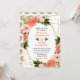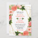 This fun and whimsical wedding invitation features watercolor coral pink red roses and foliage on a gold geometric frame. The text combines handwritten script and serif fonts for a stylish and modern look. This is perfect for a spring or summer rustic wedding.