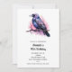 Une invitation d'anniversaire avec l'image d'un corbeau noir aux ailes violettes roses. Une aquarelle rose derrière cet oiseau mystique.