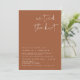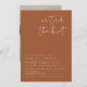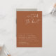 Cette invitation de réception de mariage intime présente une police manuscrite audacieuse et un design moderne et minimaliste associé à une combinaison de couleurs orange rouille brûlé et beige. C'est parfait pour tout couple contemporain, industriel ou minimaliste. Modifiez *la plupart* du texte et toutes les couleurs pour répondre à vos besoins et ajoutez une photo au verso pour un effet personnel.