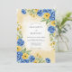 This design features a vibrant palette of royal blue and sunny yellow, creating a cheerful watercolor aesthetic. Lush hydrangeas and delicate ranunculus are accented by leafy greenery and small berries. A soft cream wash adds warmth to the artistic botanical arrangement. This floral artwork evokes the brightness of a seasonal outdoor ceremony.