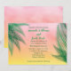 Des feuilles de palmiers vert vif mettent ce faire-part de mariage sur un arrière - plan de coucher de soleil aquarelle lui donnant une atmosphère tropicale et le rendant parfait pour la destination, l'été, la piscine ou mariage sur la plage au coucher du soleil.