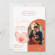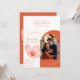 Un faire-part de mariage moderne avec texte orange vif et des détails en rouge pamplemousse. Cette nuance d'orange s'appelle Verona Sunset. Détails en faux or, une silhuette d'une fleur délicate. La typographie moderne et la photo en forme voûtée.