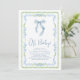 Jolie invitation à la douche bébé garçon avec des cadres d'aquarelle vert et bleu d'inspiration vintage, une aquarelle arc coquette bleue, "Oh Baby" présenté dans un script bleu chic, et le nom de la future mère et les détails de douche dans la typographie serif classique.