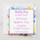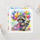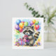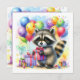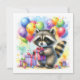 Raccoon invitation d'anniversaire thématique pour une petite fille. Raton laveur doux tenant un cadeau d'anniversaire entouré de ballons d'anniversaire en bleu, jaune, vert, violet et rose.