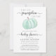 Une invitation à la douche virtuelle pour bébé, mignonne, joyeuse et claire, sans distinction de sexe, avec "A Sweet Little Citrouille Is On Its Way", écrite dans un mélange de typographie moderne douce et grise et d'écriture stylée, et d'une aquarelle verte à la menthe pastel d'un citrouille. En dessous, "baby shower" est écrit dans le même script élégant et vous pouvez personnaliser le nom de la mère et les détails de la douche virtuelle dans une typographie moderne minimale.