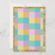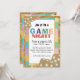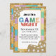 Cette invitation personnalisée à la fête comporte un thème de nuit de jeu de plateau rétro coloré. Un motif vérificateur dans les couleurs pastel borde l'invitation à apparaître comme espaces sur un plateau de jeu. Les dés de parties scintillant d'or sont représentés dans les coins supérieur gauche et inférieur droit.