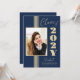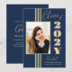 Cette élégante invitation à la remise des diplômes de la Classe 2025 a des rayures dorées, un cadre photo et du texte sur un arrière - plan bleu marine.