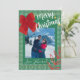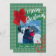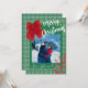 Christmas themed, Plaid green background, red bow and red leaf, and gold elements frame the card and the couples photo. Editable name template.