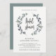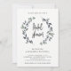 Cette invitation à la douche botanique moderne est composée d'une cheminée d'aquarelle de feuilles dans les tons verts, bleus et gris tendance pour un look à la fois minimaliste et rustique.