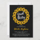 Faire-part de fête de fin d'études bohème jaune doré et noir avec couronne de tournesols ensoleillés. Création originale de Holiday Hearts Designs (tous droits réservés).