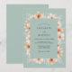 De délicates fleurs dans des tons orange pêche chaud dérivent sur un fond de sauge doux, créant une atmosphère élégante et romantique. Ce design évoque une sensation de chaleur douce et de beauté naturelle, parfaite pour une célébration charmante.