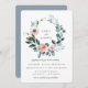 Belle couronne aquarelle de feuillage de jardin et de fleurs délicates, invitation de mariage. Le dos de la carte présente une couleur bleu poussiéreux uni.