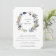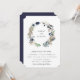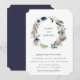 Magnifique couronne aquarelle de feuillage et de fleurs taupe, bleu marine et verts, invitation de mariage. Le dos de la carte présente une couleur bleu marine uni.