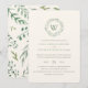 Invitation de mariage élégante et simple en papier avec typographie classique, couronne de verdure à l'aquarelle avec monogramme.