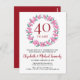 Cette carte d'invitation pour le 40e anniversaire de mariage présente une délicate couronne de verdure florale faite de fleurs sauvages, de plantes et de papillons. L'invitation peut être facilement personnalisée avec vos informations spéciales d'anniversaire de rubis. Le dos de l'invitation présente une guirlande florale assortie encadrant les dates d'anniversaire en élégant texte blanc sur fond rouge rubis. Les fournitures de fête et la papeterie assorties sont disponibles dans la collection "40e anniversaire de mariage Fleurs roses".