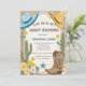 "Yeehaw ! Sellez votre monture, partenaire, car un petit cow-boy est en route ! Préparez-vous à ôter votre chapeau et à faire envoler la poussière tandis que nous célébrons la future maman (ou les futurs parents) dans le style rustique et western avec ce charmant design pour une baby shower garçon. Imaginez un fond de sable à l'aquarelle orné d'un assortiment de cactus, d'un fer à cheval fiable, de bottes classiques et d'un chapeau de cow-boy, le tout lié par un panneau de bois patiné proclamant fièrement la 'Baby Shower' à venir.