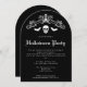 Donnez le ton pour une fête éffrayante avec cette audacieuse invitation d'Halloween en noir et blanc. Une silhouette crânienne frappante encadrée de chauves-souris et une floraison décorative crée un design spectaculaire, avec l'espace ci-dessous pour personnaliser les détails de votre fête. Choisissez une carte avec un dessus incurvé de sorte que la forme ressemble à une pierre gravée, ajoutant la touche étrange parfaite pour les rassemblements hantés, les soirées costumées ou les événements d'Halloween.