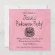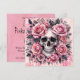 Cette invitation de style Pink-o-ween gothique présente une illustration à l'aquarelle d'un crâne humain entouré de roses roses luxuriantes, de feuilles noires et d'accents en forme de toile d'araignée. Le design mélange des éléments macabres sombres avec des floraux romantiques doux, créant un équilibre saisissant entre beauté et mortalité.