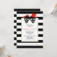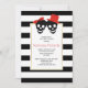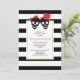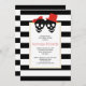 Les éléments de cette invitation à la douche nuptiale mariage d'Halloween moderne sont un couple de crâne noir amusant avec un arc rouge la mariée et casquette rouge le marié jumelé avec une élégante bordure motif noir et blanc.