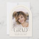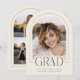 Introducing our cream and charcoal gray arch photo graduation announcement—a sleek, modern keepsake designed with minimalist elegance. The front features an arch-shaped photo with a thin border and the word "grad" partially overlaying the photo. Personalize the template by adding your graduation year, name, and school to create your announcement with ease. On the back, upload 4 more of your favorite photos. © Kimbellished, LLC