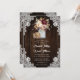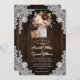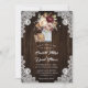 Faire-part de mariage fleurie rustique avec bouquet de fleurs bordeaux, crème et mauve et verdure à l'intérieur d'un bocal de maçon contre un arrière - plan en bois de grange orné de dentelle fleurie blanche et de lumières scintillantes. Un design de carte parfait pour inviter vos invités à votre mariage rustique bordeaux et crème.