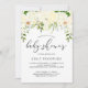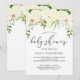 Un bel arrangement floral d'ivoire et de crème d'aquarelle hydrangée, de roses et de pivoines s'enclenchant dans la verdure apparaît au-dessus des mots "baby shower" dans un élégant script d'écriture manuscrite. Customisez le reste du texte avec le nom de la future maman, la date, le lieu et les détails RSVP. Idéal pour un baby shower de printemps ou d'été. Voir notre collection de Baby showers floraux de crème d'ivoire pour la coordination des articles.