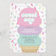 Doux ! Crème glacée et saupoudrer 1er anniversaire invitation avec des boules de crème glacée rose, violet et turquoise et des arroses arc-en-ciel.
