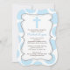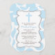 Cute invitation du Baptême avec une croix bleue sur un cadre chic et élégant sur un arrière - plan populaire à point de polka bleu. Retournez notre invitation moderne au baptême pour trouver une pochette bleue et blanche assortie. Idéal pour un baptême ou un baptême de bébé contemporain. Disponible dans notre boutique en différentes couleurs pour un petit garçon ou une petite fille.